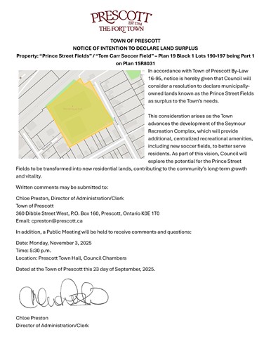 Following the September 15, 2025, Council meeting, the Town of Prescott is notifying residents of its intention to consider declaring the municipally-owned Prince Street Fields (Tom Carr Field) surplus to the Town’s needs.